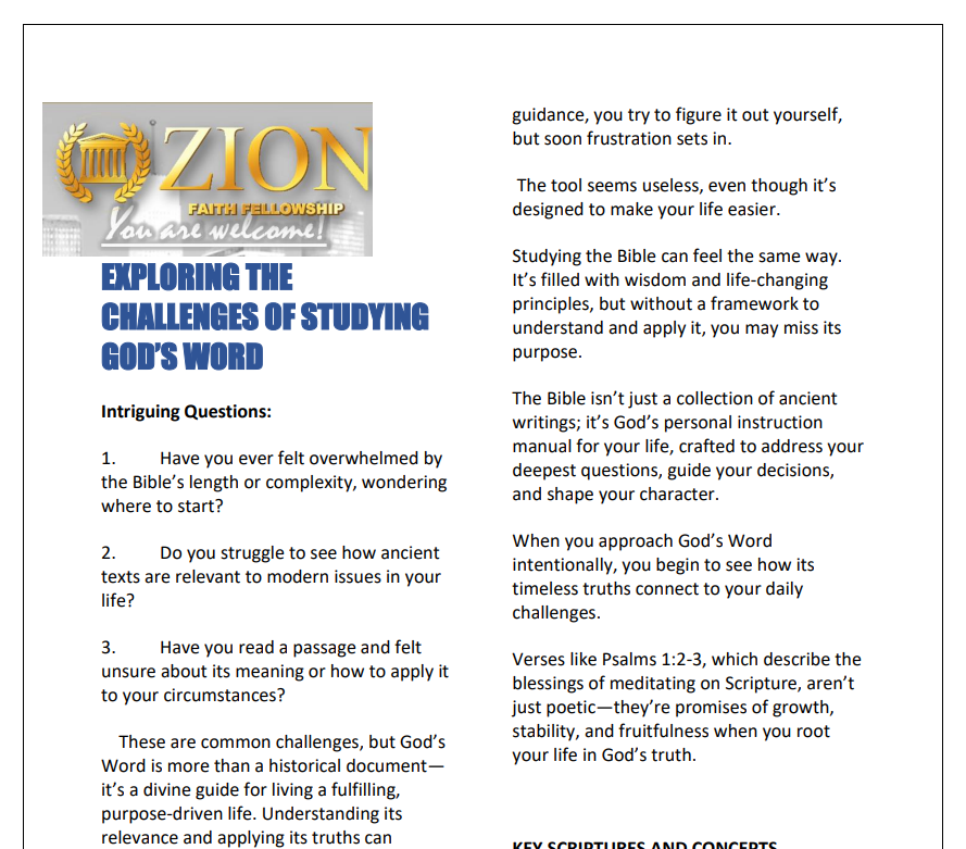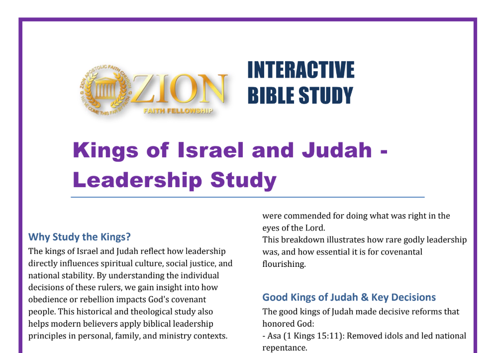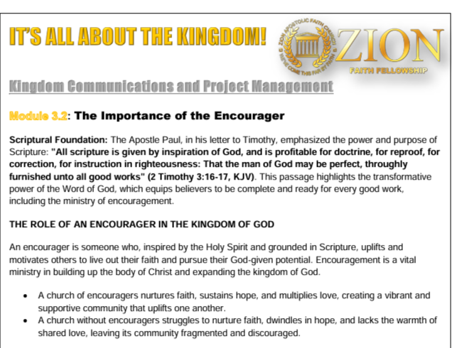 Bible Study Guides Reconciliation Part 1 & 2 10 Simple Ways To Evangelize During A Pandemic Suffering For A Purpose 12 Works of the Holy Spirit From Consecration To Covenant Part 1 From Consecration To Covenant Part 2 Major Life Changes Signs Following Kingdom Life - (Word), Walk,Witness Part 1 Kingdom Life - (Word), Walk, Witness Part 2 Kingdom Life - Word, (Walk), Witness Kingdom Life - Word, Walk, (Witness) Where Is The Love? Mission Impossible Part 1 Mission Impossible Part 2 Oh Give Thanks! Breaking Negative Cycles andCreating Healthy Systems Why God Allows Adversity In Your Life Design Your Destiny It’s All About The KingdomPart 2 - Expanded It's All About The KingdomBuilding Project The Life of Joshua Kings of Israel and Judah Leadership Study Revelations Waiting In Expectation of the Holy Ghost It's All About The Kingdom It’s All About The KingdomPart 2 - Expanded 2 From Blueprint To Roadmap Kingdom Leadership LessonsDavid vs Saul Kingdom Leadership In Captivity Babylon: Singing In A Strange Land It’s All About The Kingdom Part 2 It’s All About The Kingdom 3 Bible Study Tools A Kingdom Leadership StudySolomon Kingdom Leadership In Captivity Babylon: Singing In A Strange LandHandout Kingdom Principles It's All About The KingdomThe Importance of the Encourager Exploring the Challenges of Studying God's Word A Kingdom Leadership StudySolomon - Handout